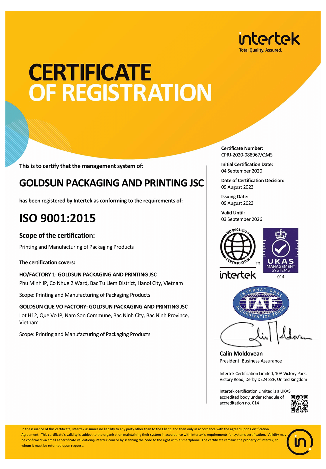 Goldsun Packaging operates under an ISO 9001-certified Quality Management System, ensuring every process (from design to production) meets international standards of consistency, safety, and performance. This certification demonstrates our commitment to maintaining quality excellence, customer satisfaction, and continual improvement across all operations.